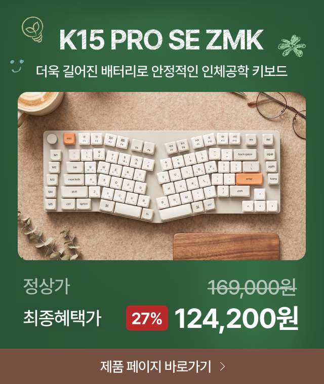 K15 PRO SE 레트로 파스텔 컬러가 드디어 공개되었습니다.부담 없이 가벼운 두께, 귀여운 파스텔 포인트 컬러, 그리고 ZMK 기반의 확실한 배터리 효율까지!